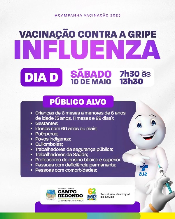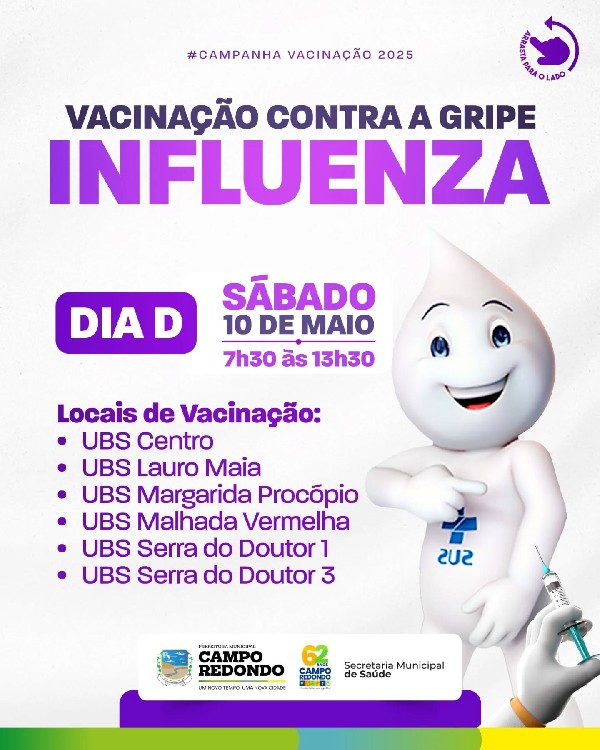 Neste sábado, 10 de maio, será o dia D da vacinação contra a gripe influenza, das 7h30 às 13h30, em vários postos da cidade!